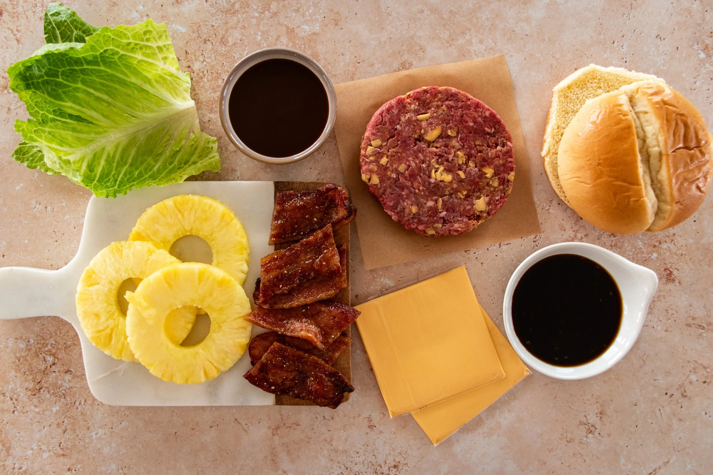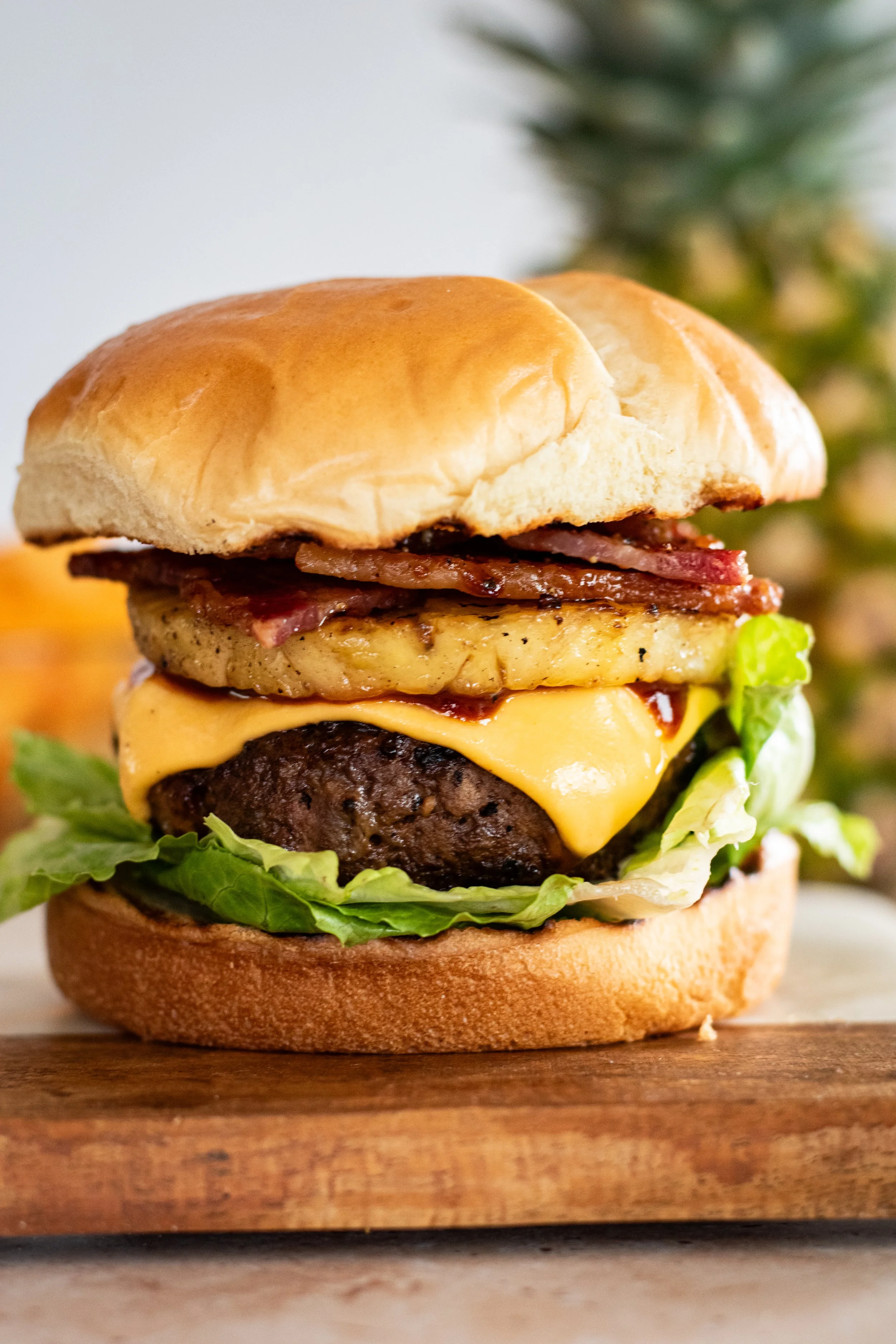 Once the patties are cooked to your liking, how I assemble the burgers are: bottom bun, lettuce, patty with melted cheese, bbq sauce, pineapple bacon then top bun.